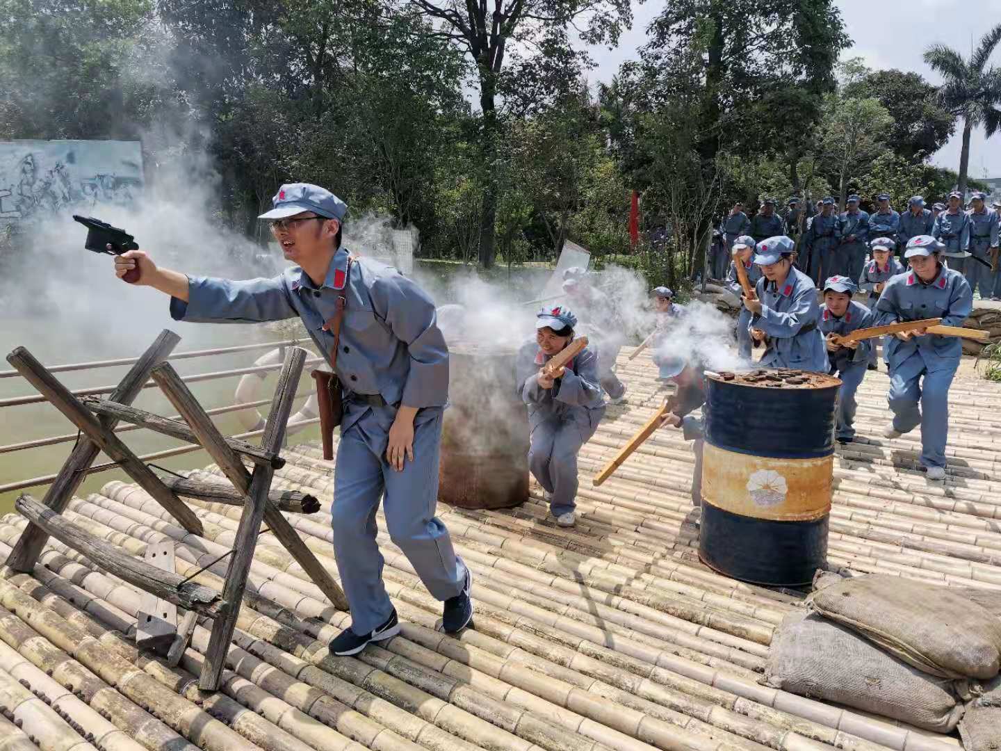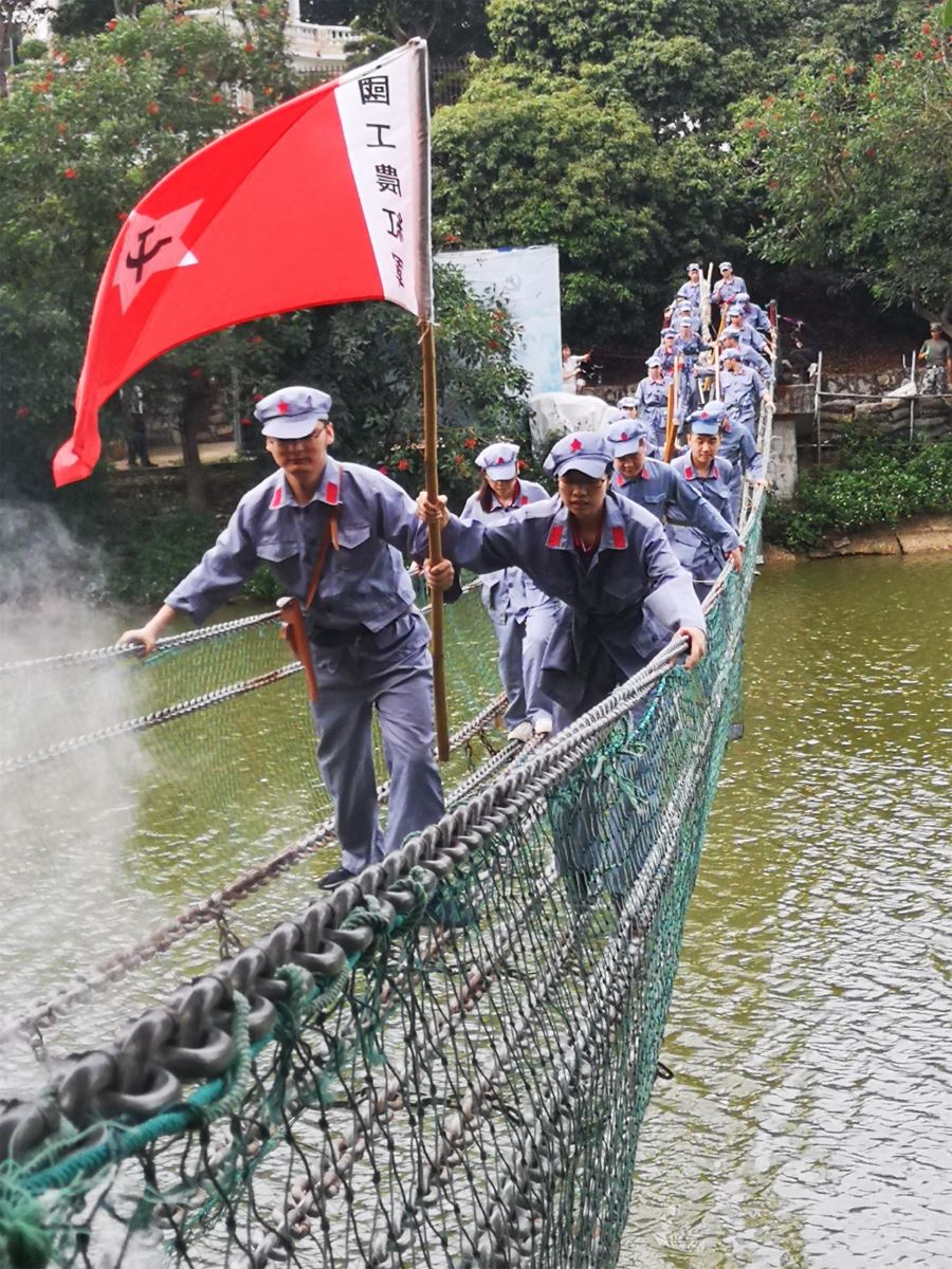 活動在肇慶高新區(qū)復(fù)興園綜合拓展基地進(jìn)行,通過“前線支援”、“合炸碉堡”、“血戰(zhàn)湘江”和“飛奪瀘定橋”等模擬長征情景拓展。讓團(tuán)員青年們親身體驗紅軍長征的艱難。